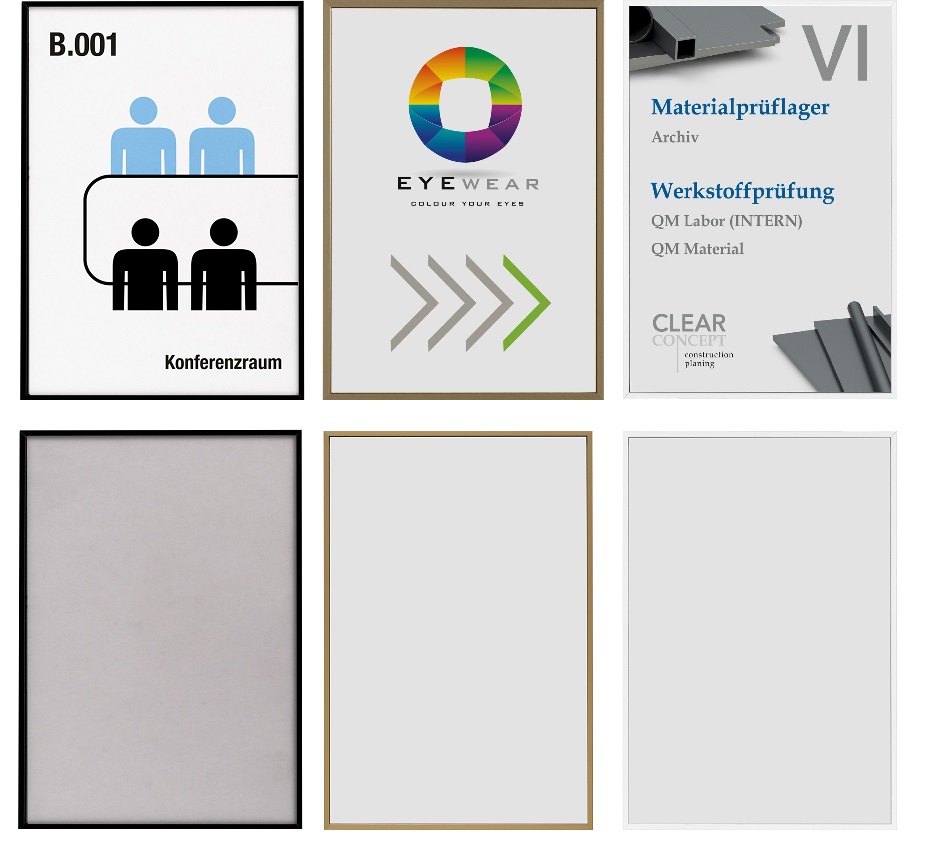 Vlak elegant bewegwijzeringsysteem uitgevoerd in een aluminium inschuifprofiel met zwarte of bronskleurige of witte omlijsting. Zeer eenvoudige wissel van print. Madrid bewegwijzeringslijn kenmerkt zich in het algemeen door zijn elegantie maar nog meer door het complete en uitvoerige assortiment al is dat bij de gekleurde varianten zwart, brons en wit minder het geval dan bij de zilverkleurige uitvoering. Bij aantallen en op aanvraag zijn andere kleuren ook mogelijk. De borden met prints die men kan insteken zijn voorzien van een 1,2 mm ontspiegelend transparant plexiglas. Montage van de borden is in de regel simpel m.b.v. plakstrips en/of schroeven. Bij bestelling de gewenste kleur vermelden.