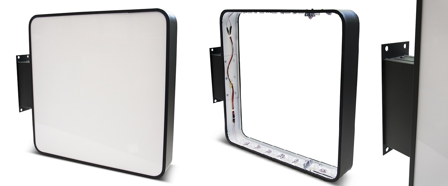 Het frame is gemaakt van zwart gepoedercoat aluminium, wat zorgt voor weinig gewicht (4,75 kg) aan de wand en corrosiebestendigheid. De lichtbak is voorzien van 2 mm plexiglas. De ingebouwde ledverlichting (24 W) is energiezuinig en effectief en zorgt voor uitstekende zichtbaarheid. De lichtbak wordt op een beugel haaks op de gevel gemonteerd. Zie voor details de afbeeldingen. Voorzien van decoratie tegen meerprijs.
