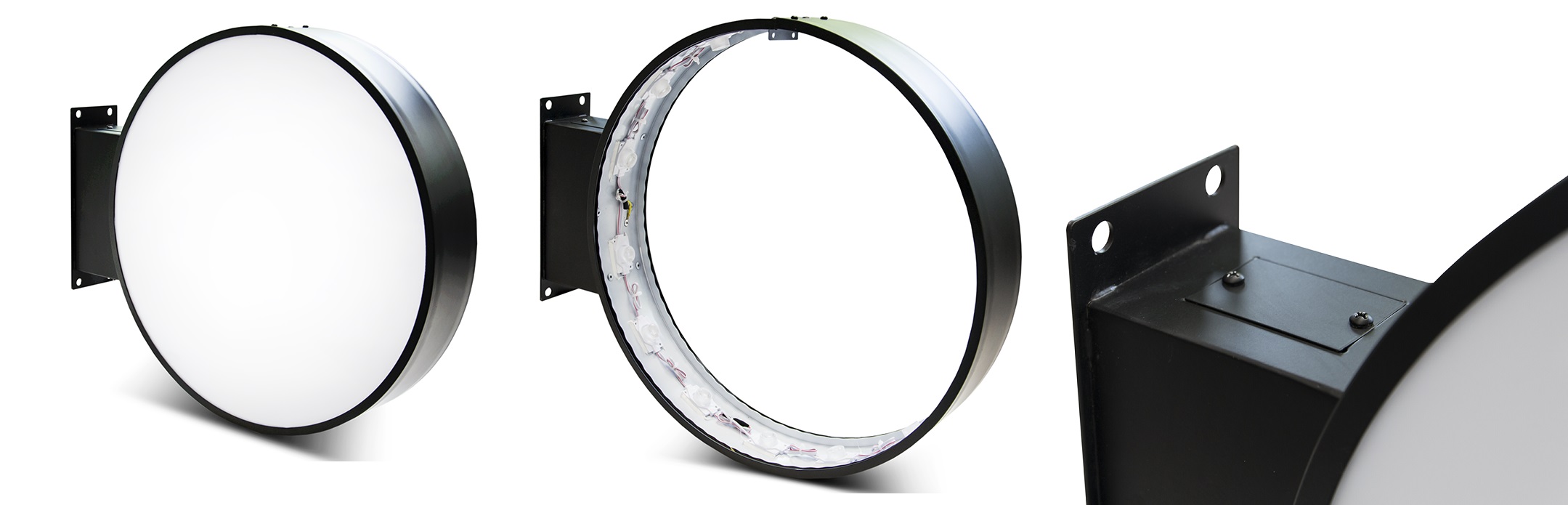 Het frame is gemaakt van zwart gepoedercoat aluminium, wat zorgt voor weinig gewicht (3,6 kg) aan de wand en corrosiebestendigheid. De lichtbak is voorzien van 2 mm plexiglas. De ingebouwde ledverlichting (21 W) is energiezuinig en effectief en zorgt voor uitstekende zichtbaarheid. De lichtbak wordt op een beugel haaks op de gevel gemonteerd. Zie voor details de afbeeldingen. Voorzien van decoratie tegen meerprijs.