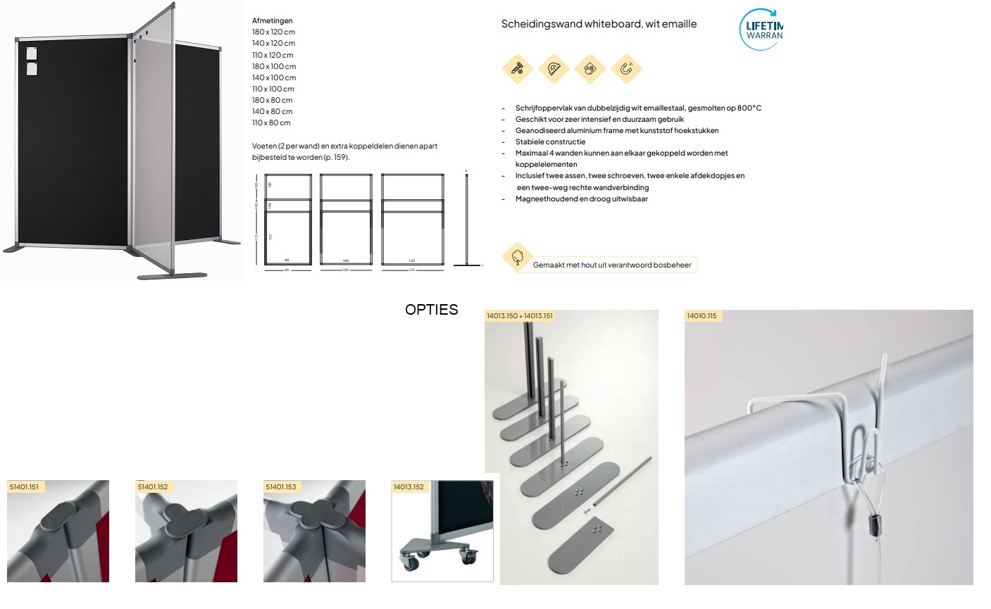 Dubbelzijdige scheidingswanden zijn de ultieme oplossing om werkruimtes flexibel en veelzijdig in te richten. De wanden zijn solide en voorzien van een strak en modern aluminium profiel. Beschikbaren uitvoeringen zijn email (magneethoudend en droog uitwisbaar) en tegen meerprijs in lichtdoorlatend opaal, als prikbord en met bedrukte email. Opgegeven afmeting is excl. aluminium profiel (incl. dan bij hoogte en breedte 5 cm optellen). Let op: excl. voeten (keuze uit vrijstaand of muurpositie model en verrijdbaar). Overige opties zijn de koppelstukken en wandhaken. Zie tevens de afbeeldingen.